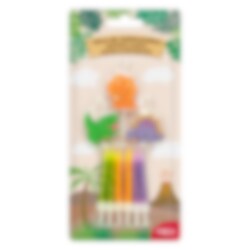 Verpakking met 12 taartkaarsjes in de kleuren paars, geel en groen, samen met 3 iets grotere kaarsjes met afbeeldingen van schattige dino's. De perfecte decoratie om je taart mee te versieren voor een kinderfeestje met een leuk dinothema.