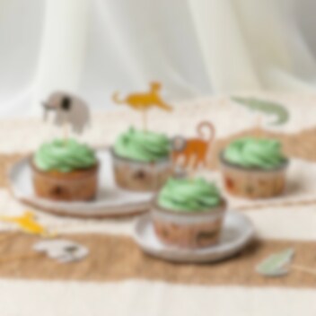 12 caketoppers met safaridieren in verschillende maten. Perfect als je je cupcakes, taarten of andere gebakjes wilt versieren. Ze zijn gemaakt van papier en hout en hebben een hoogte van ongeveer 8 cm.