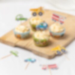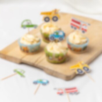 12 grappige caketoppers met voertuigen in verschillende maten. Perfect als je je cupcakes, taarten of andere gebakjes wilt versieren. Ze zijn gemaakt van papier en hout en hebben een hoogte van ongeveer 8 cm.