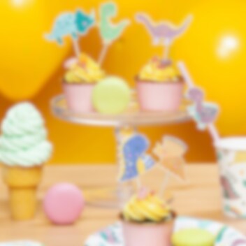 6 caketoppers met stijlvolle afbeeldingen van dinosaurussen. Perfect om zowel taarten als cupcakes mee te versieren en het kinderfeestje een extra gezellige touch te geven.