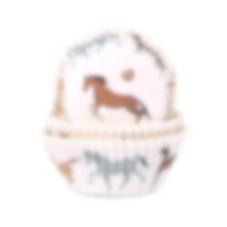 50 muffinvormpjes met afbeeldingen van prachtige paarden op een witte achtergrond. Een leuk accessoire om muffins of cupcakes in te bakken voor een kinderfeestje met een paardenthema. De muffinvormpjes hebben een bodemdiameter van 5 cm.