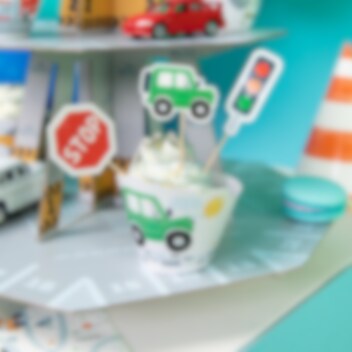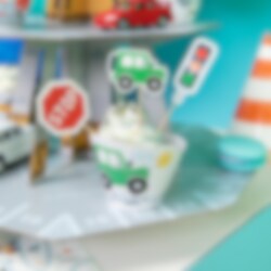6 cupcakewikkels gemaakt van karton met verschillende coole voertuigen, perfect als decoratie voor je muffinvormpjes. De breedte is 7,5 cm en de hoogte ongeveer 6 cm.