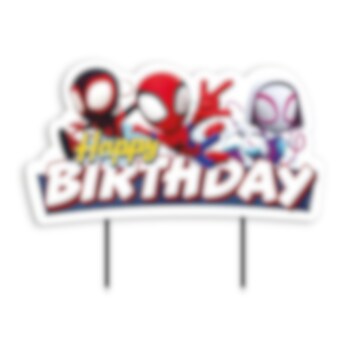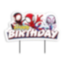 Caketopper van karton met de tekst "Happy Birthday" en leuke afbeeldingen van Spidey and His Amazing Friends! Hoogte ongeveer 13 cm.