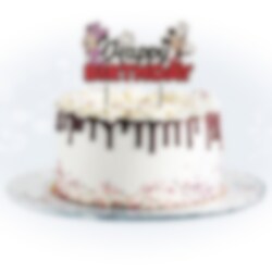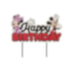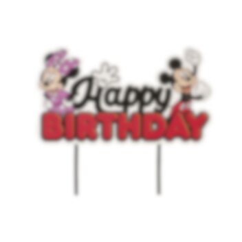 Cake Topper van karton met de tekst "Happy Birthday" en charmante afbeeldingen van Mickey en Minnie Mouse. Hoogte ongeveer 14,5 cm.