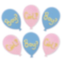 6 stuks suikerdecoraties in mooie pastelkleuren met de woorden "Boy?" en "Girl?" in goud. Versier deze op de taart of gebakjes als het tijd is voor een Gender Reveal-feestje.