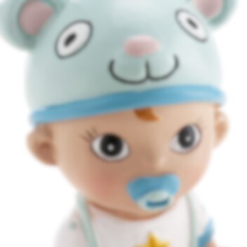 Deze schattige taartdecoratie stelt een kleine babyjongen voor die op een blauw kussen zit en een flesje in zijn hand houdt. Perfect voor het decoreren van taarten bij doopfeesten, naamgevingen of babyshowers.