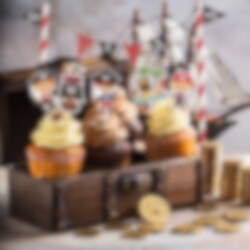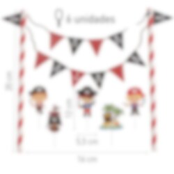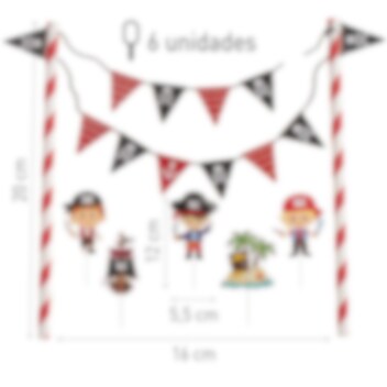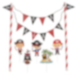 Geef de verjaardagstaart een echte piratenlook met deze taartdecoratieset! Met piraten, een schatkaart, een piratenvlag en een slinger wordt de taart onderdeel van een spannend avontuur op zee. De slinger is 20 cm hoog en de taartdecoraties variëren tussen 5,5 en 12 cm – perfect voor kleine piraten die dol zijn op piratenfeestjes!