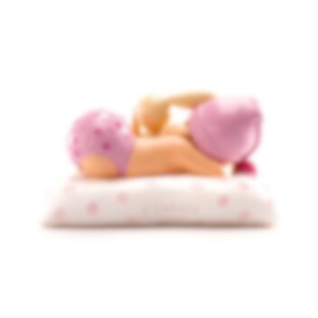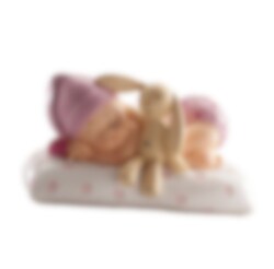 Maak je taart extra speciaal met deze prachtige taartdecoratie van een slapende baby in roze met een schattige konijnenknuffel. Perfect voor doopfeesten, babyshowers of gender reveal-feesten.