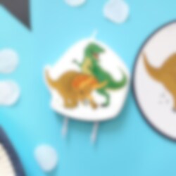Taart kaars met motieven van een Tyrannosaurus Rex en een Triceratops. Een leuke decoratie voor op de taart als er een dinosaurus thema kinderfeestje is. De taart kaars is ongeveer 10 cm hoog.
