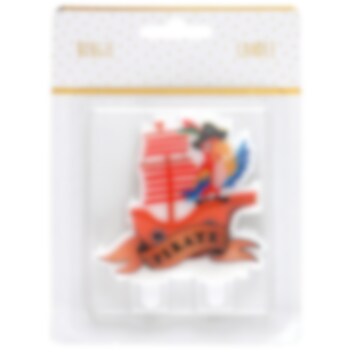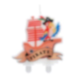 Taartkaars in de vorm van een papegaai op een piratenschip, met kleurrijke afbeeldingen. Stijlvol om je taart of gebakjes mee te versieren. De taartkaars is 7,5 x 7,5 cm groot.