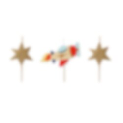 Breng de verjaardagstaart naar nieuwe hoogten met deze 3 taartkaarsjes in de vorm van een charmant vliegtuig en twee gouden sterren. De taartkaarsjes zijn 4,5 x 5 cm groot.