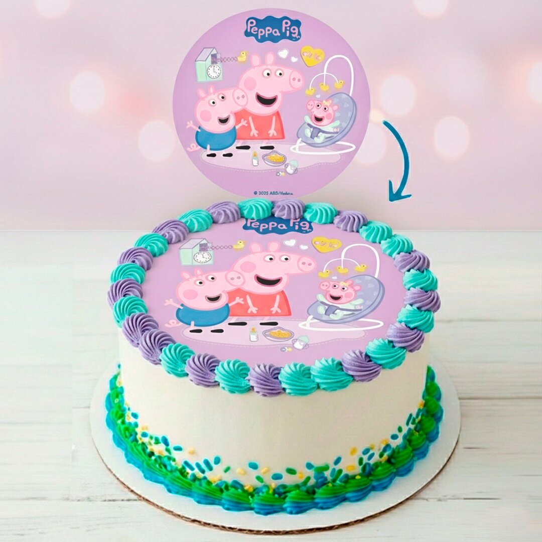 Leg de taartprint eenvoudig direct op de taart en verander snel een gewone taart in een feestelijke verjaardagstaart die gegarandeerd gewaardeerd wordt door alle kleine Peppa Pig-fans. De taartprint heeft een diameter van circa 20 cm en past perfect op de meeste ronde taarten.
