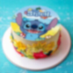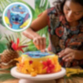 Taartprint van fondant met een schattige afbeelding van Stitch. De taartprint is klaar om direct op de taart te plaatsen en heeft een scherper resultaat dan een ouwelprint. Bovendien heeft de print een heerlijke vanillesmaak. De taartprint heeft een diameter van ca. 20 cm.