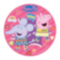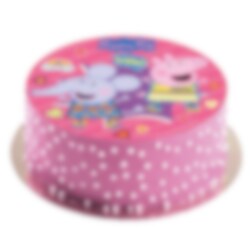Taartprint van suikervrije fondant met een schattige afbeelding van Peppa Pig en Olifant Emily tegen een kleurrijke achtergrond uit de tv-serie Peppa Pig. De taartprint is klaar om direct op de taart te plaatsen en heeft een scherpere print dan een ouwelprint. Bovendien heeft de afbeelding een heerlijke vanillesmaak. De taartprint heeft een doorsnee van ongeveer 20 cm.