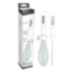 Voorzorgsmaatregelen bij gebruik: Buiten bereik van kinderen bewaren. Reinig de thermometer met een vochtige doek. Laat het gedeelte met de sonde niet weken en plaats het niet in de vaatwasser. Maak het uiteinde van de siliconen spatel met de hand of in de vaatwasser schoon.