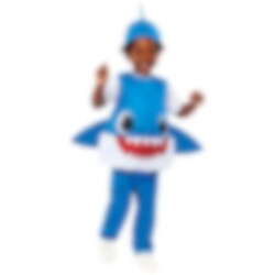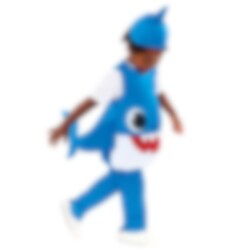 Het Blauwe Baby Shark kostuum bestaat uit een topje, een blote broek en een bijpassende hoed met de afbeelding van de haai Daddy Shark uit Pinkfong's lied Baby Shark. Het kostuum is gemaakt van 100% polyester en is verkrijgbaar in een maat die geschikt is voor kinderen tussen de 3 en 4 jaar. Het moet met de hand gewassen worden en voorzichtig worden afgedruipd.