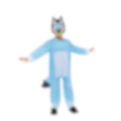 Verander jezelf in het geliefde karakter Bluey met dit charmante kostuum! Dit kostuum bevat een one-piece kostuum met Bluey's kenmerkende uiterlijk en een bijbehorende staart, evenals een zachte vilten masker. Gemaakt van 100% polyester.