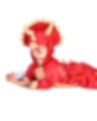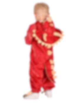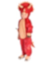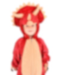 Dinosaurus Triceratops Jumpsuit-kostuum bevat een jumpsuit in een rode kleur met gouden details die een triceratops voorstellen. Het kostuum is gemaakt van 100% polyester en is verkrijgbaar in een maat geschikt voor kinderen van 4 tot 5 jaar. Met de hand wassen en afdruipen. ongeveer 110 cm lang.