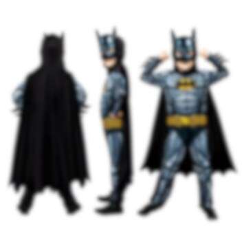 - Inhoud: Jumpsuit met gedetailleerde Batman-prints, een zwarte cape en een masker.