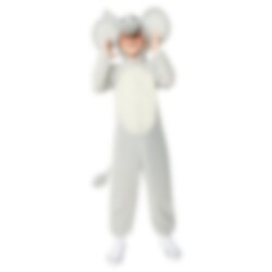 - Inhoud: Grijs onepiece-kostuum met rits op de borst, staart, en een capuchon met grote olifantenoren en een olifantenslurf.