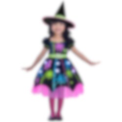 Voel je als een kleurrijke heks klaar voor magische avonturen met dit Neon Spider Witch Kostuum voor kinderen. Bij de jurk hoort een hoed en neonkleurige details die echt de aandacht trekken. Panty's en schoenen zijn niet inbegrepen.