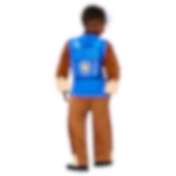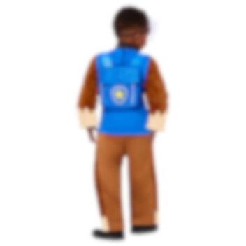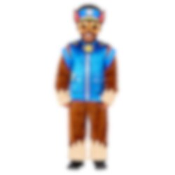 Het Paw Patrol Chase-kostuum deluxe bevat een jumpsuit in de kleuren van Chase, een halfmasker van plastic dat Chase's gezicht voorstelt en een rugzak.