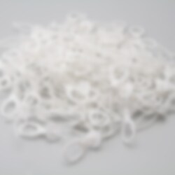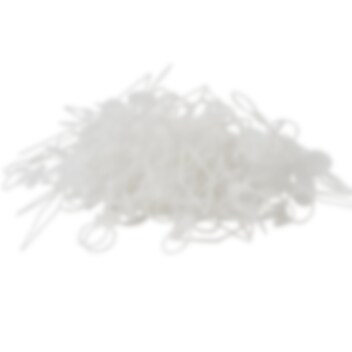 100 witte ballonstuiter. Praktisch product dat tijd bespaart bij het sealen van latexballonnen. Om te gebruiken, plaatst je de lus rond het uiteinde van de ballon en trek je deze vast. Het product is gemaakt van kunststof en is ongeveer 3 x 1 cm groot.