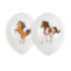 6 witte latex ballonnen met afbeeldingen van mooie paarden. Een geweldige decoratie voor je paarden-kinderfeestje. De ballonnen hebben een diameter van 27,5 cm wanneer opgeblazen en kunnen gevuld worden met lucht of helium. Als je ze met lucht opblaast, raden we aan een ballonpomp te gebruiken.