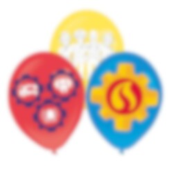 6 ballonnen in de kleuren rood, geel en donkerblauw met verschillende afbeeldingen uit het Brandweerman Sam-thema. De ballonnen hebben een diameter van ongeveer 28 cm wanneer opgeblazen en kunnen worden gevuld met lucht of helium.