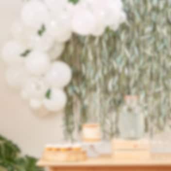 Ballonnenboog in witte kleuren met 6 stuks eucalyptusbladeren die je bouwt zelf samen. Een mooie decoratie die past bij de babyshower of doop. De verpakking bevat 45 stuks ballonnen en Engelse instructies om het te bouwen. De ballonnenboog wordt ongeveer 4 meter lang.