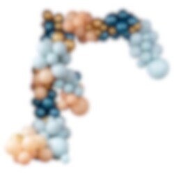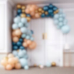 Chique ballonnenboog in blauw-groen, perzik en goud-chroom tinten die je zelf bouwt. Een werkelijk indrukwekkende decoratie die geschikt is voor kinderfeestjes, feestjes of bruiloften. Het pakket bevat een volledige 200 stuks ballonnen in verschillende maten en accessoires. De ballonnenboog is ongeveer 12 meter lang.