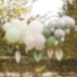 Mooi ballonslinger in groen- en wittinten met bijbehorende decoratieve palmbladeren die je zelf bouwt. Een prachtige decoratie die geschikt is voor kinderfeestjes, feestjes of babyshower. De verpakking bevat in totaal 40 stuks ballonnen in verschillende maten en accessoires. De ballonnenboog is ongeveer 4 meter lang.