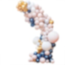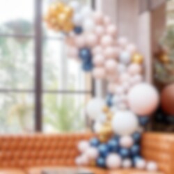 Luxe ballonnenboog in blauw, goud, poederroze en wit tinten die je zelf bouwt. Maak het kinderfeestje, feestje of bruiloft net iets exclusiever met behulp van deze set. Het pakket bevat een volledige 200 stuks ballonnen in verschillende maten en accessoires. De ballonnenboog is ongeveer 12 meter lang.