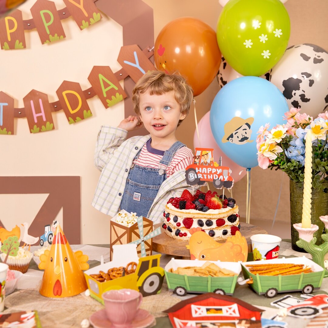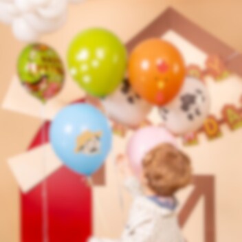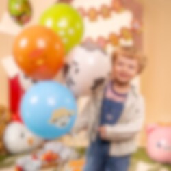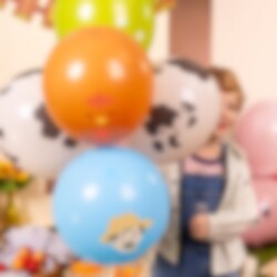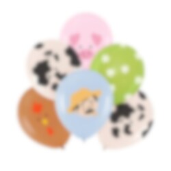 6 ballonnen met een boerderijthema die een speelse en kleurrijke decoratie vormen voor het kinderfeestje. De ballonnen hebben verschillende afbeeldingen, zoals een koe, varken, kip, bloemen en een boer, wat perfect is om een feestelijke sfeer te creëren op een boerderijfeestje.