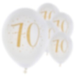 8 witte ballonnen met een 70-jarige opdruk en gouden sterren. De ballonnen zijn decoratief en passen goed bij veel andere decoraties en tafelaccessoires voor je 70ste verjaardag.