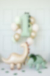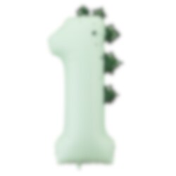 Vier groots met een indrukwekkende dinosaurusballon in de vorm van het cijfer 1. De lichtgroene kleur met decoratieve dinosaurussturken langs de rand maakt hem perfect voor een dinosaurusfeestje – en extra mooi voor een 1e verjaardag.