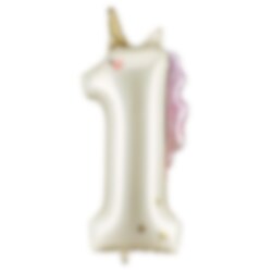 Een magische folieballon in de vorm van het cijfer 1 met prachtig eenhoorndesign. Perfect voor een 1e verjaardag of als onderdeel van een grotere eenhoorn cijferdecoratie.
