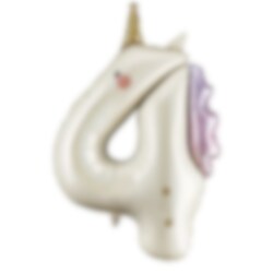 Een decoratieve folieballon in de vorm van het cijfer 4 met prachtig eenhoorndesign. Perfect voor verjaardagsfeesten of als onderdeel van een cijfercombinatie.