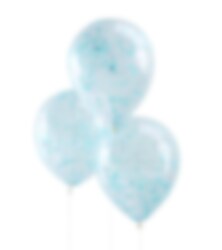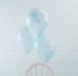 5 transparante ballonnen gevuld met lichtblauwe confetti erin. De ballonnen zijn geweldig voor feestjes, doop en babyshower. De ballonnen kunnen worden opgeblazen met lucht of met helium en hebben een diameter van ongeveer 30 cm wanneer ze volledig zijn opgeblazen.