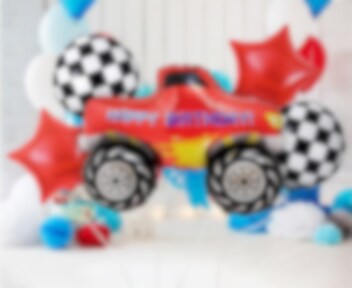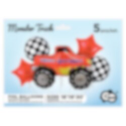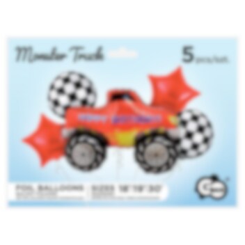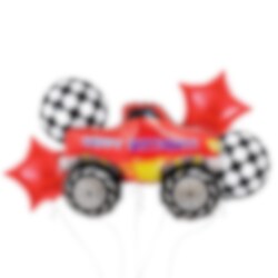 Stoer ballonboeket met verschillende folieballonnen in een Monstertruck thema. Het boeket bestaat uit een grote Monster Truck met de tekst Happy Birthday, 75 cm, twee ronde ballonnen met een dambordpatroon in wit en zwart, 35 cm en twee stervormige rode ballonnen, 35 cm. Naast de ballonnen wordt er een wit ballonlint meegeleverd.