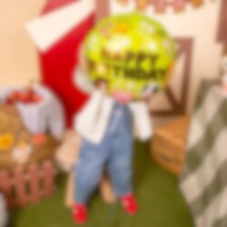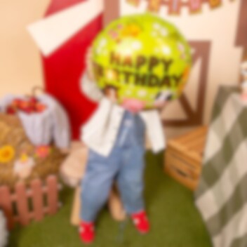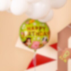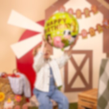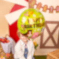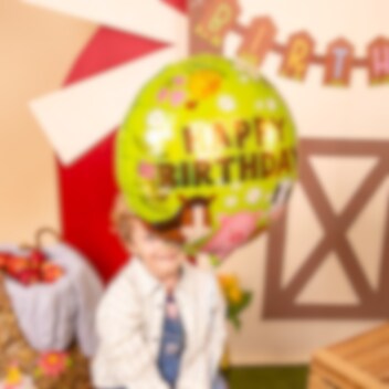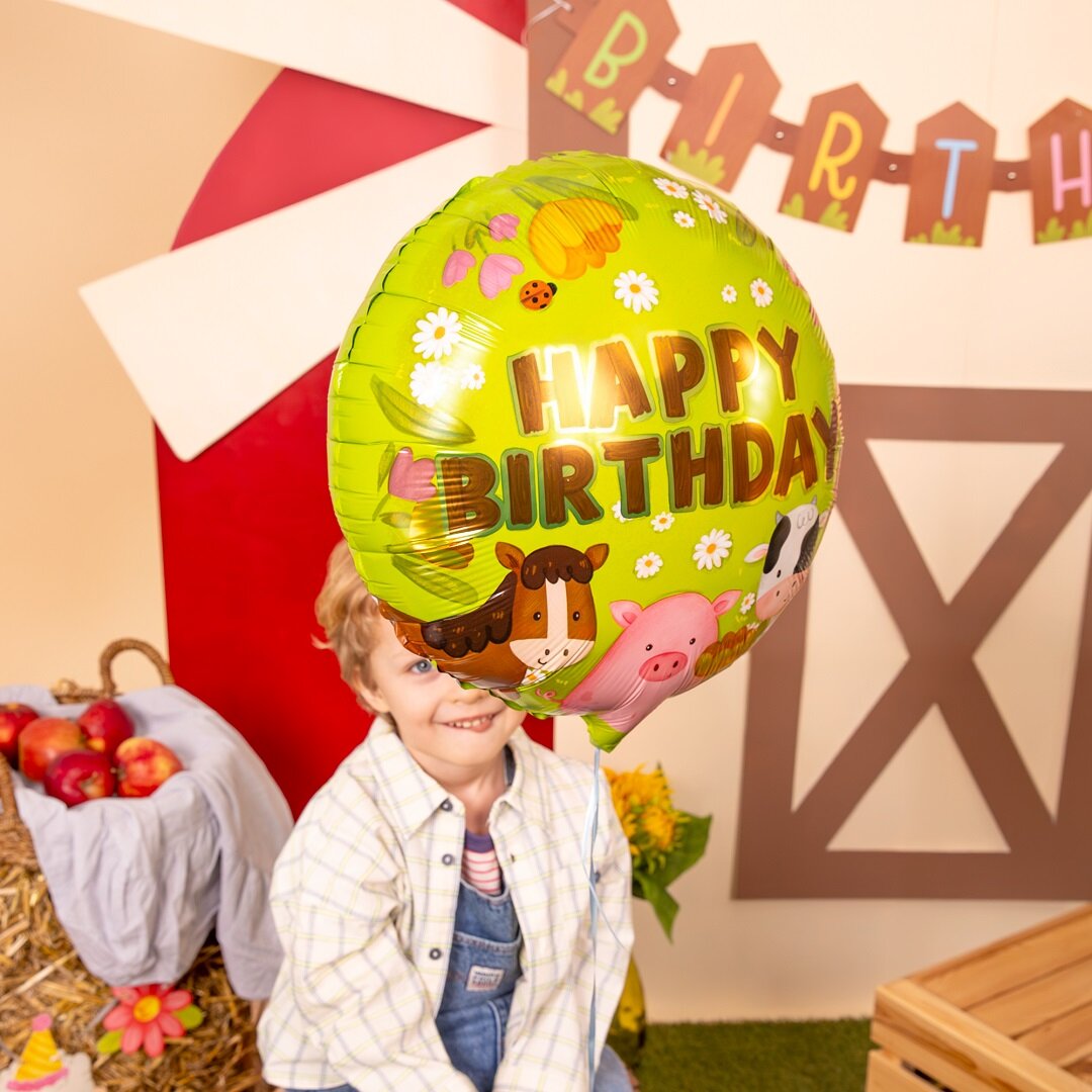 Creëer een speelse en feestelijke sfeer voor het kinderfeestje met deze ronde folieballon in boerderijthema. De ballon is versierd met een paard, varken en koe, samen met bloemen en de tekst 'Happy Birthday', waardoor het een mooie decoratie is voor een kinderfeestje met boerderijthema.