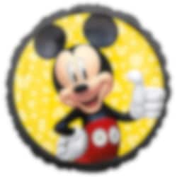 Ronde folieballon met een afbeelding van Mickey Mouse op een gele achtergrond met zwarte randen. Leuk om de kamer mee te decoreren voor een Mickey Mouse kinderfeestje. De ballon heeft een diameter van ongeveer 43 cm wanneer opgeblazen en kan worden gevuld met helium of lucht.