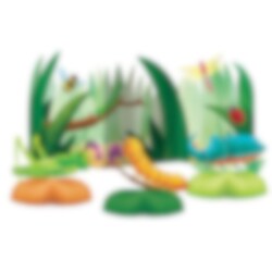 Deze kleurrijke 3D-tafeldecoraties van karton met honeycomb-onderkant zorgen voor een speelse en natuurlijke sfeer op het feest. De set bevat 4 delen: een achtergrond (30 x 69 cm), een kever (17,6 x 23 cm), een sprinkhaan (18,7 x 24,3 cm) en een rups (22,6 x 25 cm). Perfect om de natuur een plek te geven op de feesttafel!