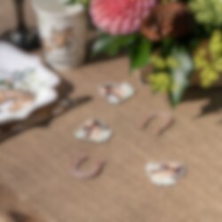 Fijne houten confetti met afbeeldingen van paarden en hoefijzers. Een luxe manier om de tafel te versieren voor het kinderfeestje. De confetti zijn 4 x 4,5 cm groot en je krijgt in totaal 10 stuks in een zakje