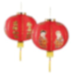 Vier het Chinese Nieuwjaar met deze ronde Chinese lantaarn van 40 cm in diameter. Het is rood met Aziatische tekens en traditionele figuren aan beide zijden, en heeft gouden draden. De lantaarn is gemaakt van papier en is perfect om zowel binnen als buiten op te hangen.