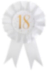 Mooie rozet in wit en goud met het getal 18 erop gedrukt. De rozet kan zowel als decoratief accessoire in bijvoorbeeld bloemstukken worden gebruikt, als door jou gedragen worden op je 18ste verjaardag. De rozet zijn 8 cm in diameter en 15 cm hoog.