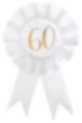 Mooie rozet in wit en goud met het getal 60 erop gedrukt. De rozet kan zowel als decoratief accessoire in bijvoorbeeld bloemstukken worden gebruikt, als door jou gedragen worden op je 60ste verjaardag. De rozet zijn 8 cm in diameter en 15 cm hoog.