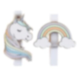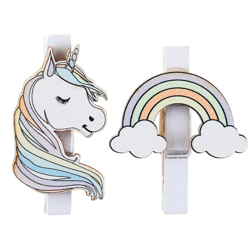 6 stuks. witte wasknijpers met motieven van kleurrijke eenhoorns en regenbogen. Mooi om mee te decoreren op je kinderfeestje of in je kamer. De wasknijpers zijn gemaakt van hout, 4 x 5 cm groot en je krijgt 3 eenhoorns en 3 regenbogen.