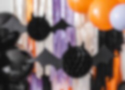 Deze decoratieve vleermuis heeft een ronde body van zwart honeycomb-papier en brede vleugels van stevig papier. Perfect als decoratie aan het plafond, bij de ingang of boven een feestelijk gedekte tafel.