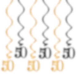 Geef het 50e verjaardagsfeest extra glans met deze hangdecoraties in zwart en goud! De set bevat zes spiraalvormige decoraties van glanzende folie, drie met het getal 50 in goud en drie in zwart.